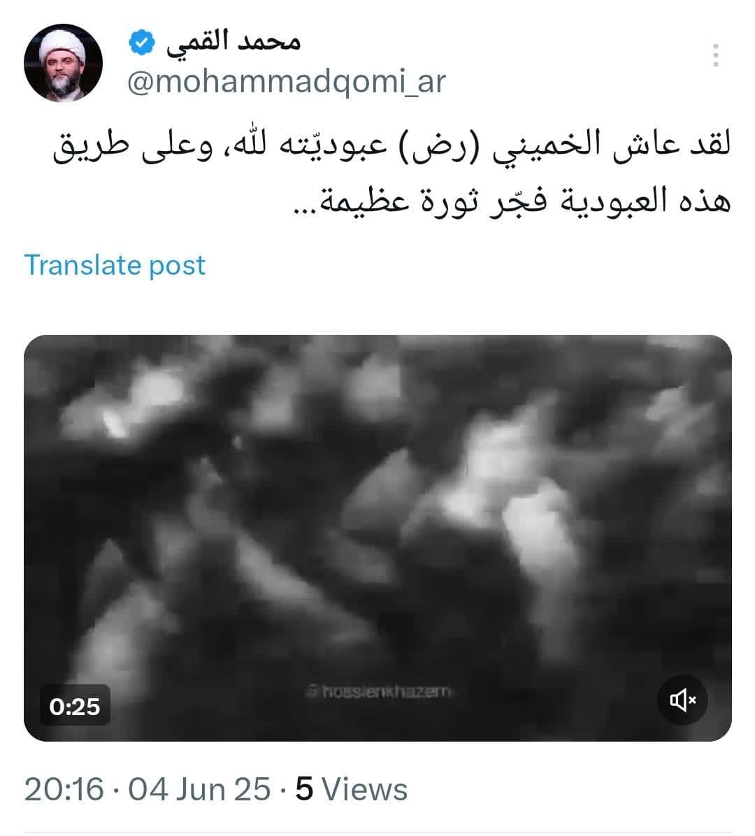 همزمان با سالروز رحلت بنیان‌گذار کبیر انقلاب اسلامی، حجت‌الاسلام محمد قمی در صفحه شخصی خود در شبکه ایکس (ویژه مخاطبان عرب‌زبان) ویدئویی از لحظه اعلام خبر رحلت حضرت امام خمینی(ره) توسط شهید نصرالله منتشر کرد و نوشت؛ خمینی(ره) بندگی‌اش را به‌جا آورد و در مسیر این بندگی، انقلابی بزرگ آفرید.