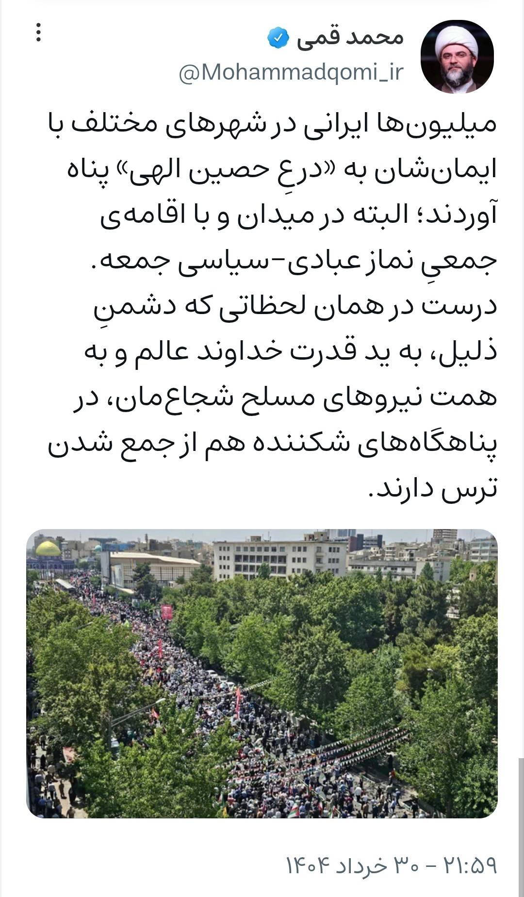 میلیون‌ها ایرانی در شهرهای مختلف با ایمان‌شان به «درعِ حصین الهی» پناه آوردند؛ البته در میدان و با اقامه‌ی جمعیِ نماز عبادی-سیاسی جمعه. درست در همان لحظاتی که دشمنِ ذلیل، به ید قدرت خداوند عالم و به همت نیروهای مسلح شجاع‌مان، در پناهگاه‌های شکننده هم از جمع شدن ترس دارند.