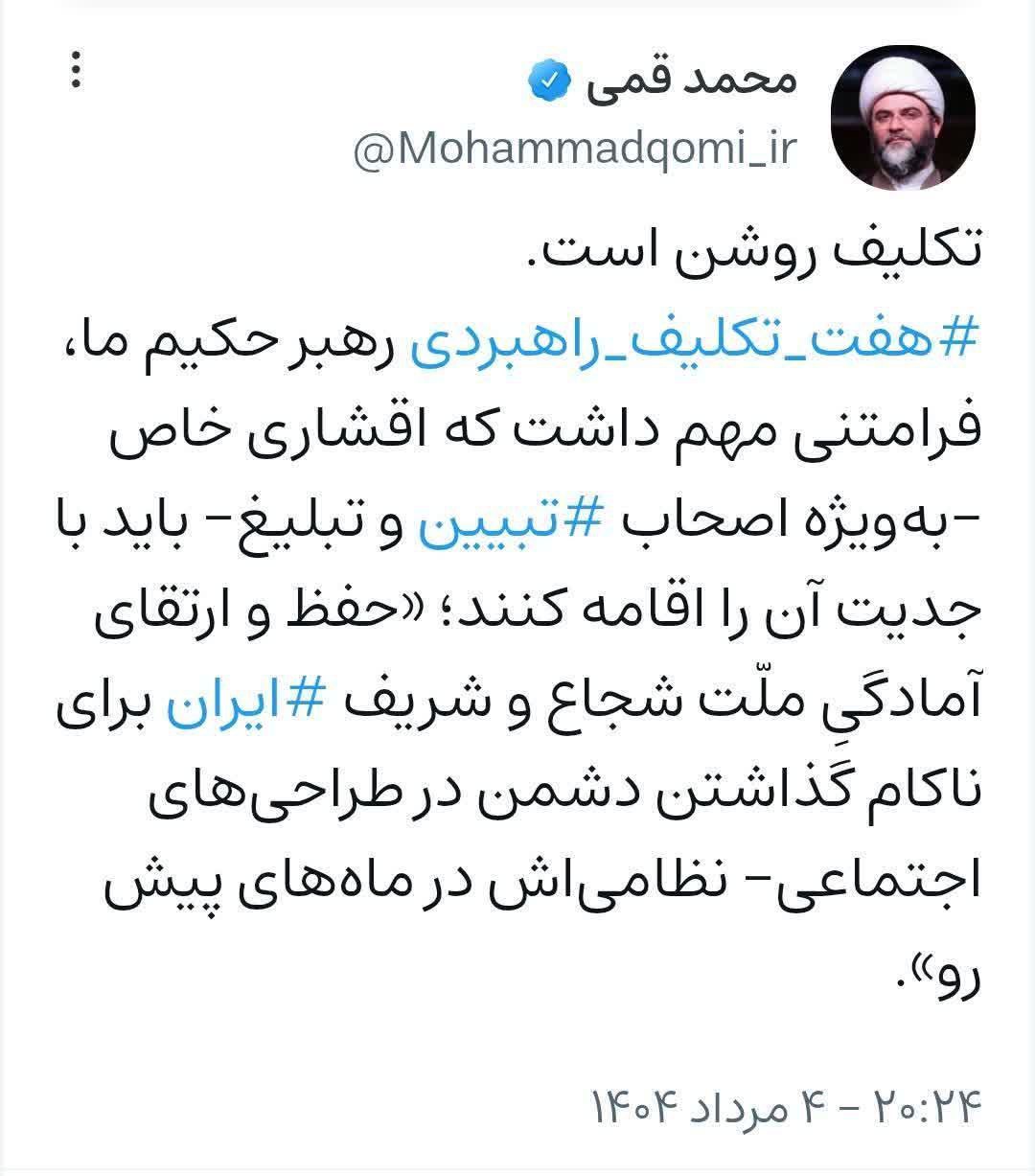 به گزارش روابط عمومی سازمان تبلیغات اسلامی، حجتالاسلام محمد قمی، در صفحه شخصی خود در شبکه ویراستی با اشاره به پیام رهبر انقلاب در چهلمین روز شهادت سرداران و دانشمندان کشورمان نوشت؛