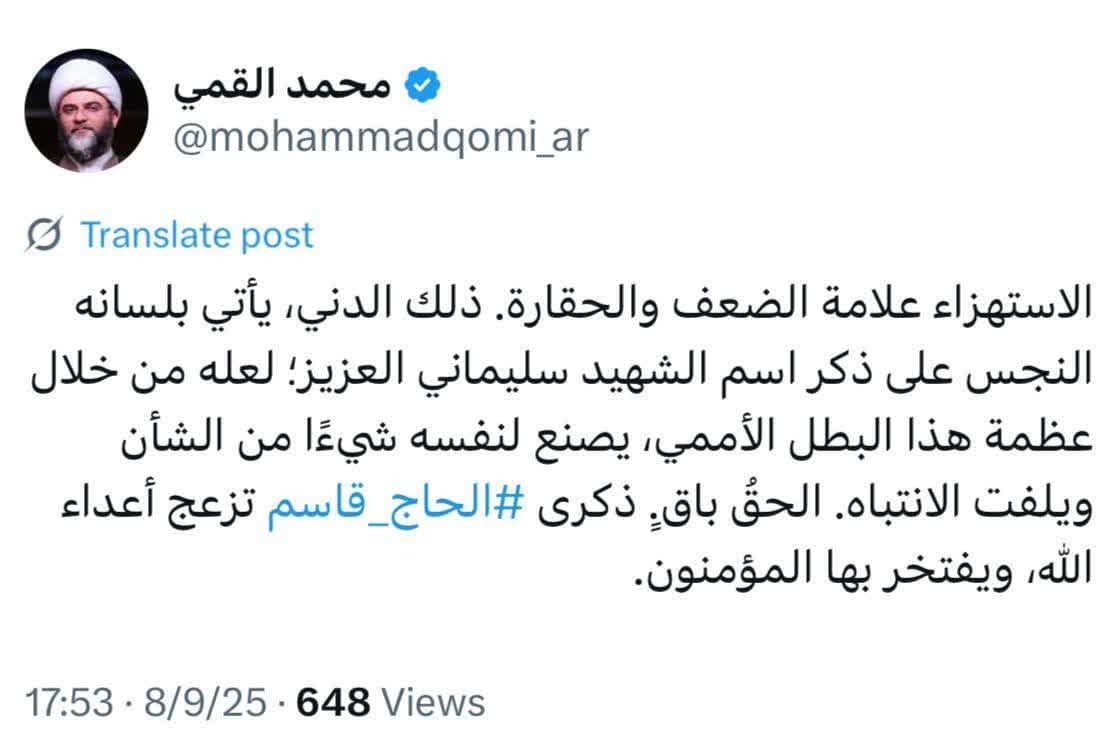 به گزارش روابط عمومی سازمان تبلیغات اسلامی، حجتالاسلام محمد قمی، رئیس سازمان تبلیغات اسلامی با اشاره به سخنران رئیس جمهور آمریکا درباره حاج قاسم سلیمانی در صفحه شخصی خود در شبکه ویراستی نوشت: «مگر یزید، شمر و اعوانش نبودند که در برابر سیدالشهدا و یاران شیدا و شجاعش، با توهین و جنایت، ملعون ازل و ابد شدند؟ آن پستفطرتِ فرومایه، نام شهید سلیمانی عزیز را به دهان آلودهاش میآورد تا از عظمت قهرمان ملی ما برای خود توجه بخرد. استهزا زبانِ عاجز است. حاج قاسم خار چشم دشمن خدا و افتخار مؤمن است.»