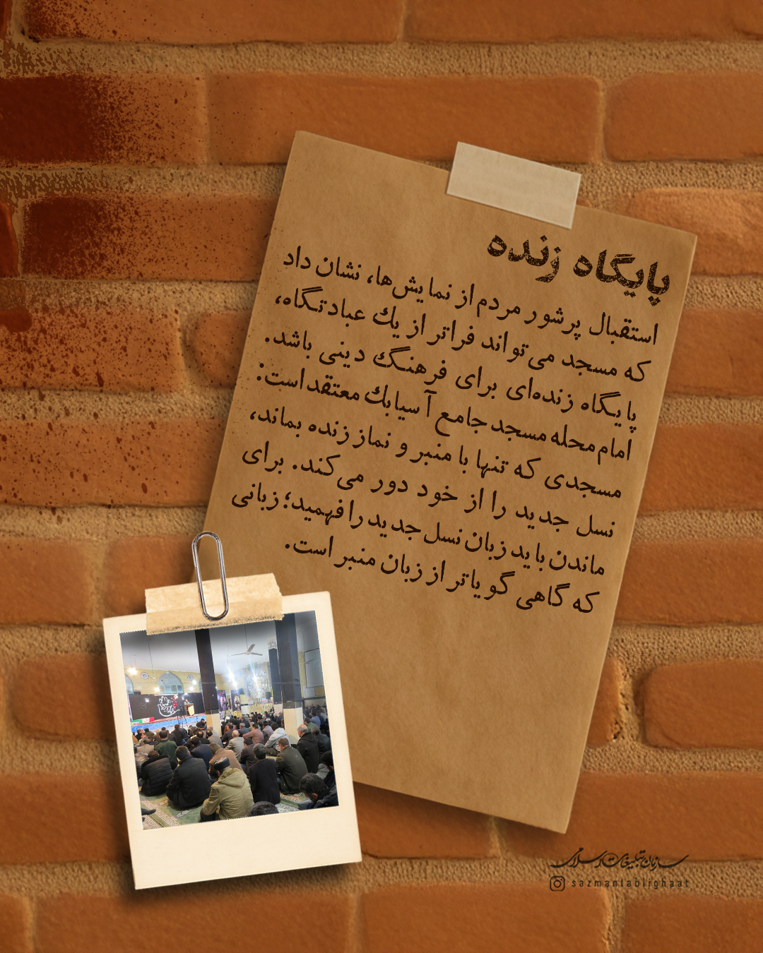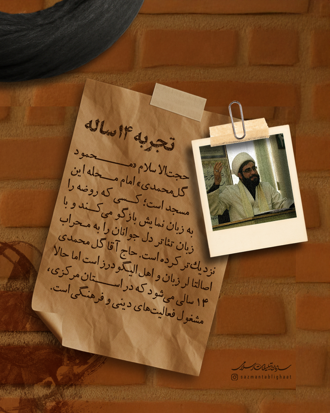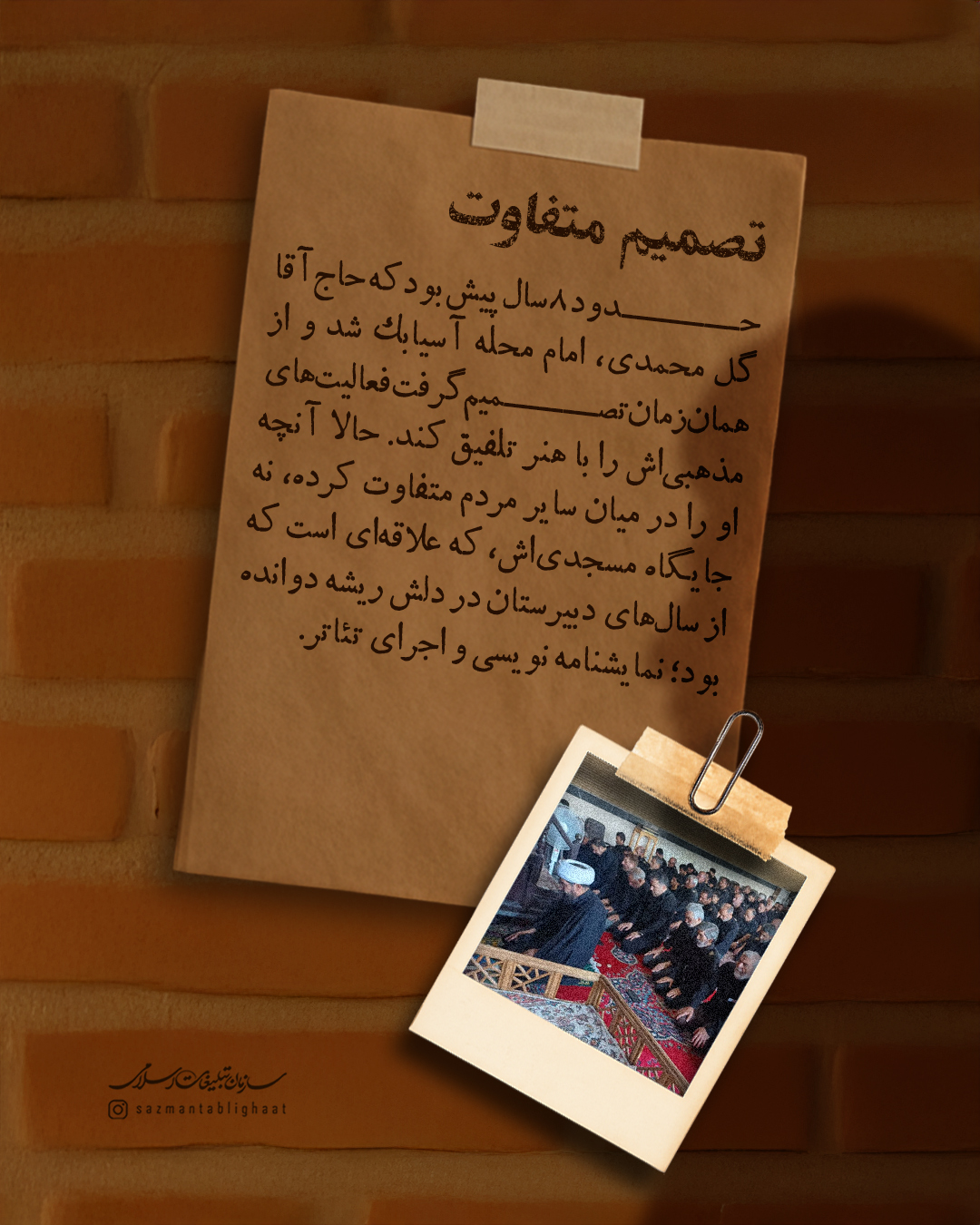 به گزارش روابط عمومی سازمان تبلیغات اسلامی، حجتالاسلام «محمود گلمحمدی» امام محله مسجد جامع آسیابک در شهر زرندیه استان مرکزی است. او که از نوجوانی به ادبیات و نمایشنامهنویسی علاقهمند بود، با نوشتن نمایشنامه و اجرای نمایش در مسجد تجربهی متفاوتی برای اهالی این محله فراهم کرده است. اتفاقی که منجر به رونق مسجد و حضور فعالانه مردم، خصوصا جوانان و نوجوانان، در مسجد شده است.