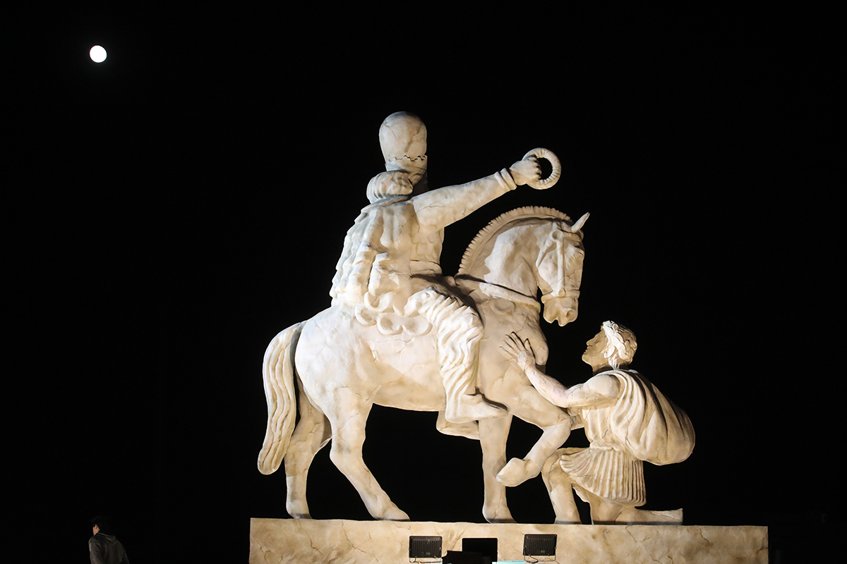 این رویداد فرهنگی و هنری به مناسبت رونمایی از مجسمه «زانو زنندگان برابر ایران» ساخته پیام قانع برگزار شد. این مجسمه هفت متری از جنس فایبرگلاس، روایتی از اقتدار تاریخی ایرانیان را به تصویر می‌کشد، زمانی که والرین، پادشاه روم، پس از حمله به ایران، در برابر پادشاه ساسانی تسلیم شد و زانو زد. در پایه مجسمه ۱۳ پرده جانمایی شده است که هرکدام مقطع مهمی از مقاومت ایرانیان در برابر بیگانگان را نشان می‌دهد؛ از پایداری در برابر حملات اسکندر تا مقابله با استعمار، جنگ تحمیلی و پیروزی بر داعش. این مجسمه به مدت ۲۰ روز در میدان انقلاب خواهد بود و سپس به میدان آزادی منتقل می‌شود.