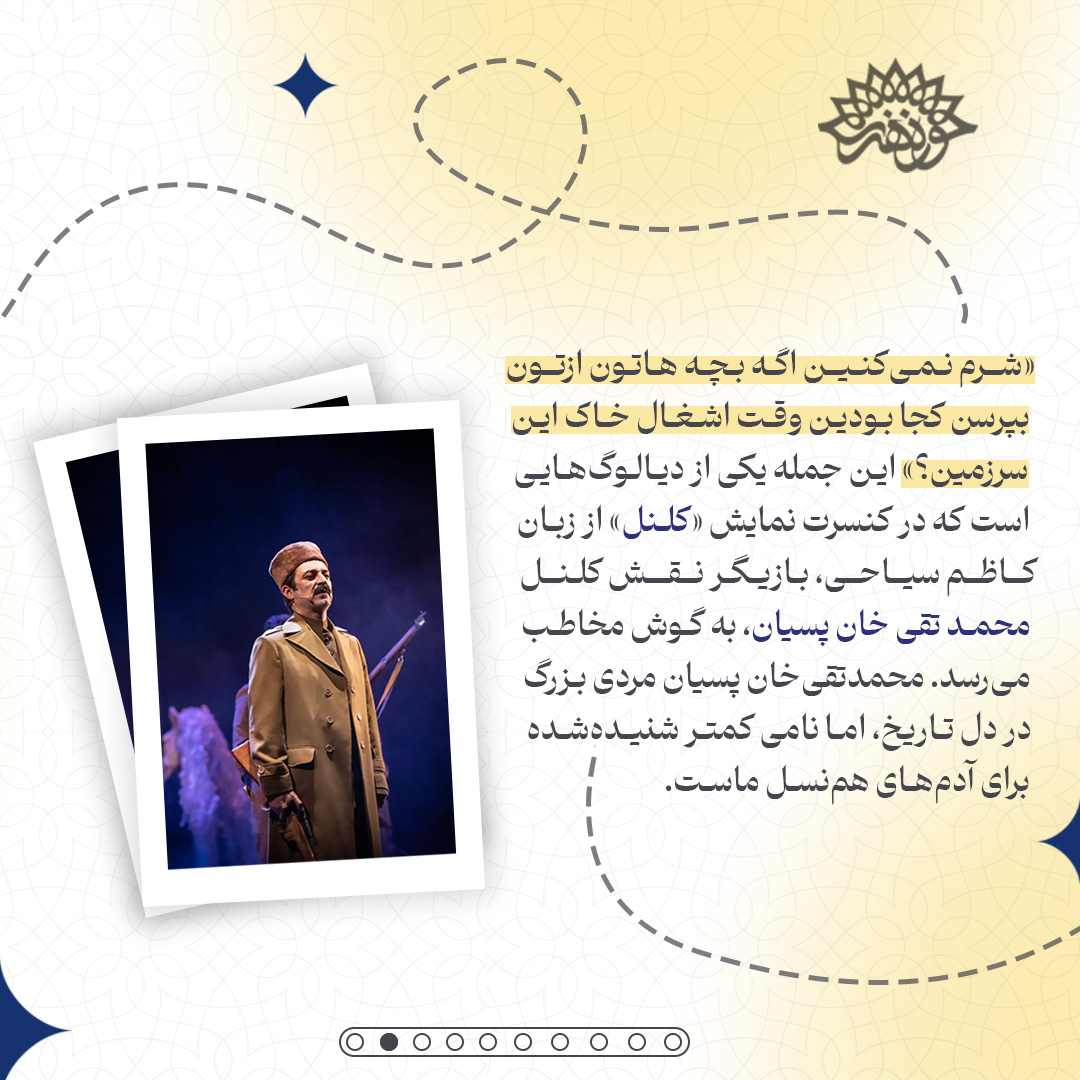 به بهانهی پایان کار کنسرت نمایش کلنل در این شماره از نشریه دیجیتال مروری میکنیم بر این اثر هنری و زندگی سرباز وطن، کلنل محمدتقیخان پسیان.