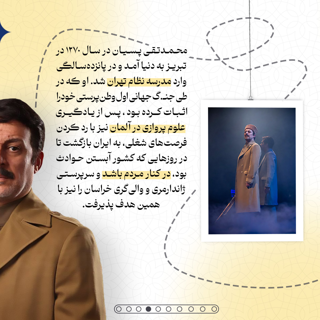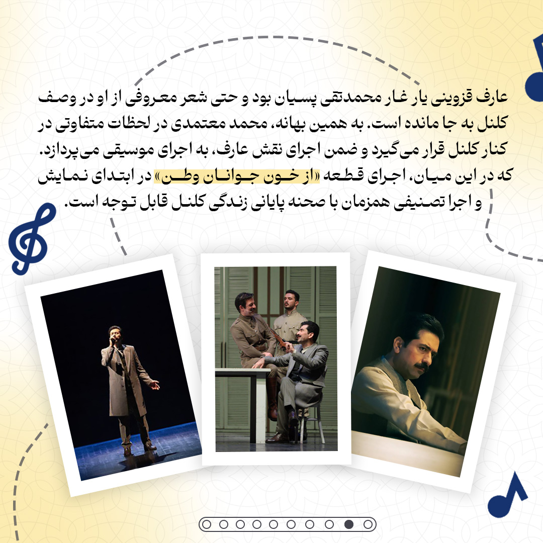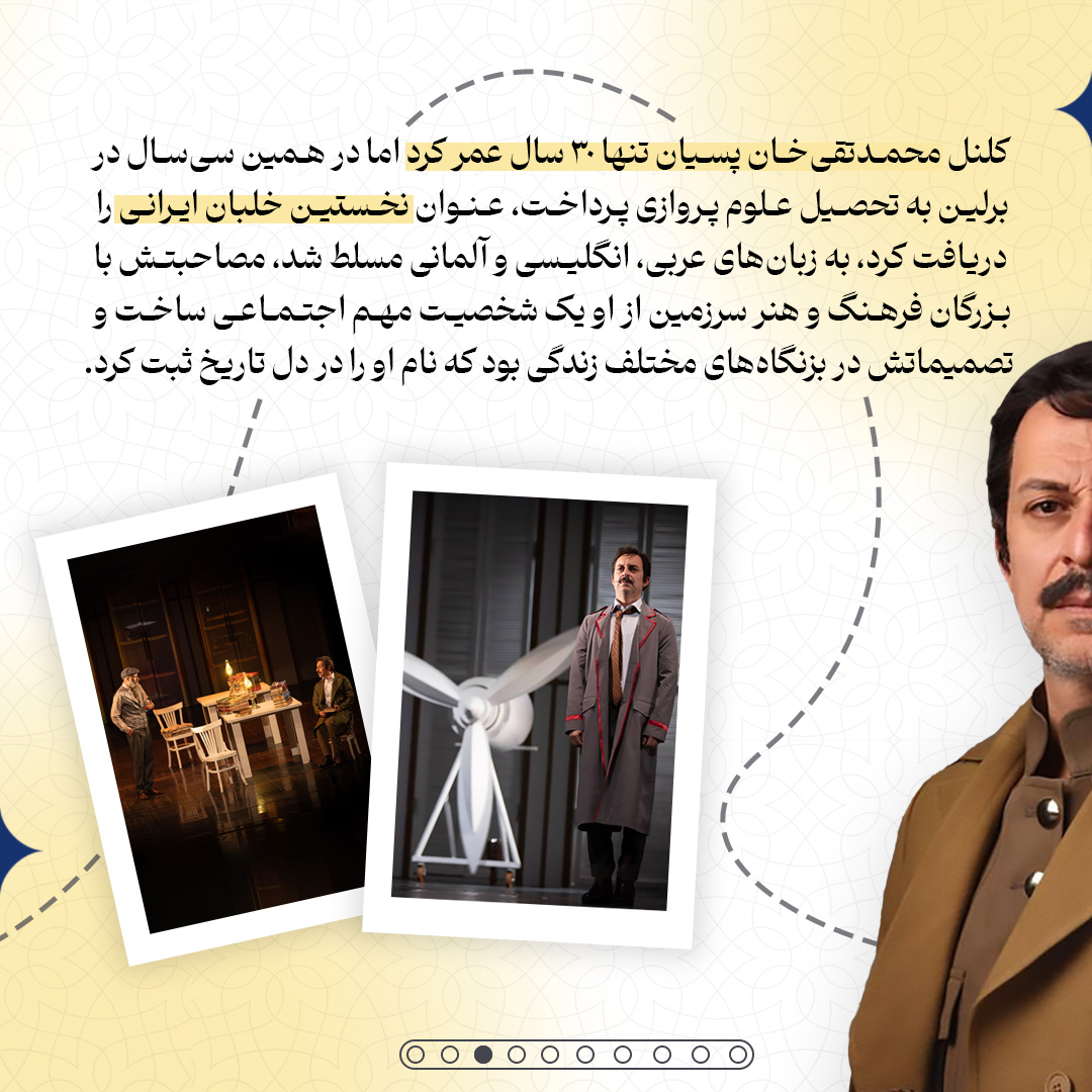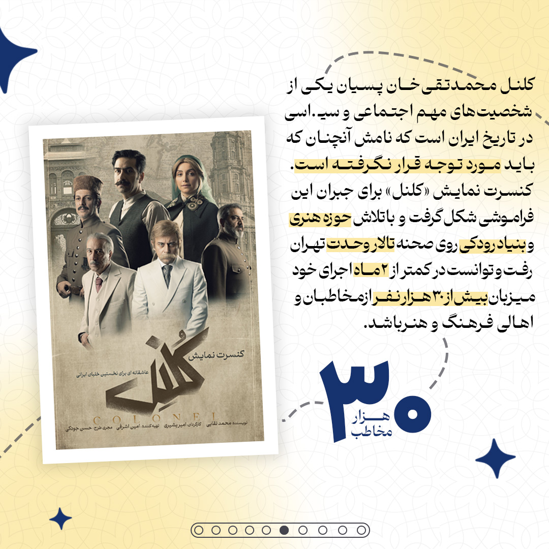 به گزارش روابط عمومی سازمان تبلیغات اسلامی، «کلنل محمدتقیخان پسیان» یکی از شخصیتهای گمنام اما مهم در تاریخ ایران است. کنسرت نمایش «کلنل» روایتی از زندگی نخستین خلبان ایرانی بود. بهبهانهی پایان کار کنسرت نمایش «کلنل»، در این شماره از نشریه دیجیتال نگاهی میاندازیم به این اثر هنری و زندگی این سرباز وطن را قدری مرور میکنیم.