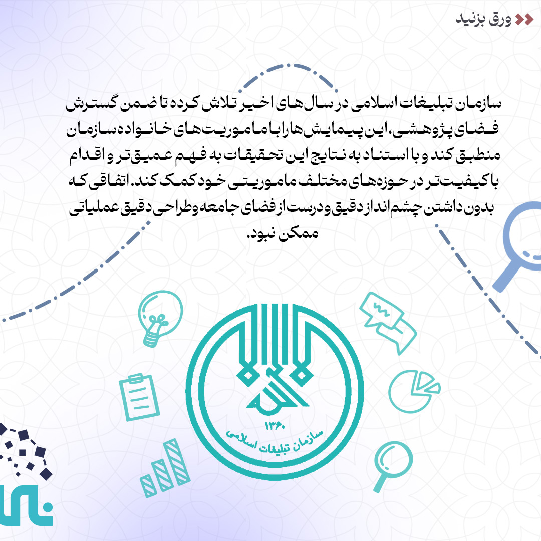 به گزارش روابط عمومی سازمان تبلیغات اسلامی، برنامهریزی اصولی بدون رسیدن به چشمانداز دقیق و درست از فضای جامعه ممکن نیست و این جایی است که نقش مراکز پژوهشی و افکارسنجی پررنگ میشود. در این شماره از نشریه دیجیتال نگاهی میاندازیم به مراکز پژوهشی خانواده سازمان تبلیغات اسلامی و اقدامات اخیر آنها را با یکدیگر مرور میکنیم.