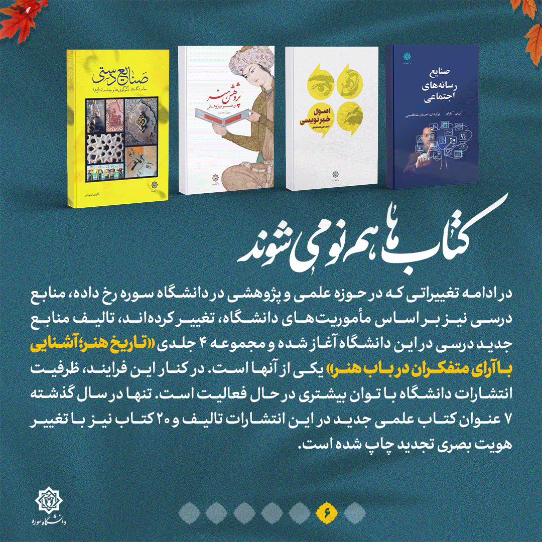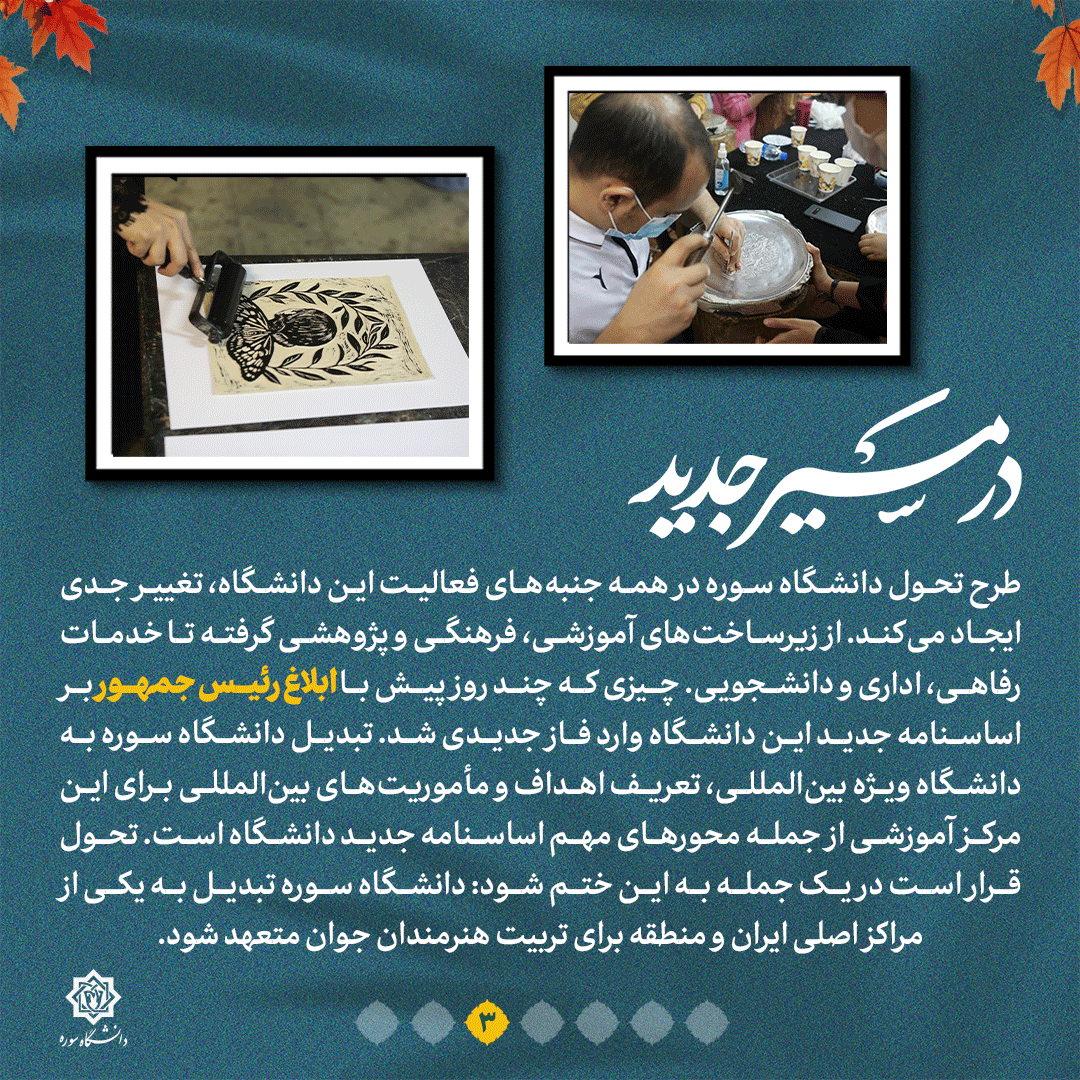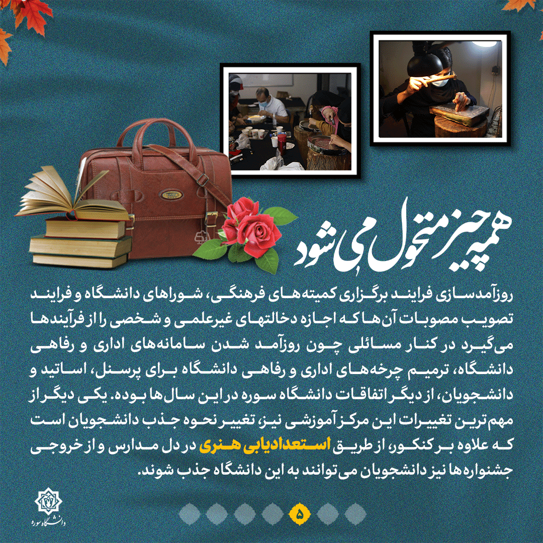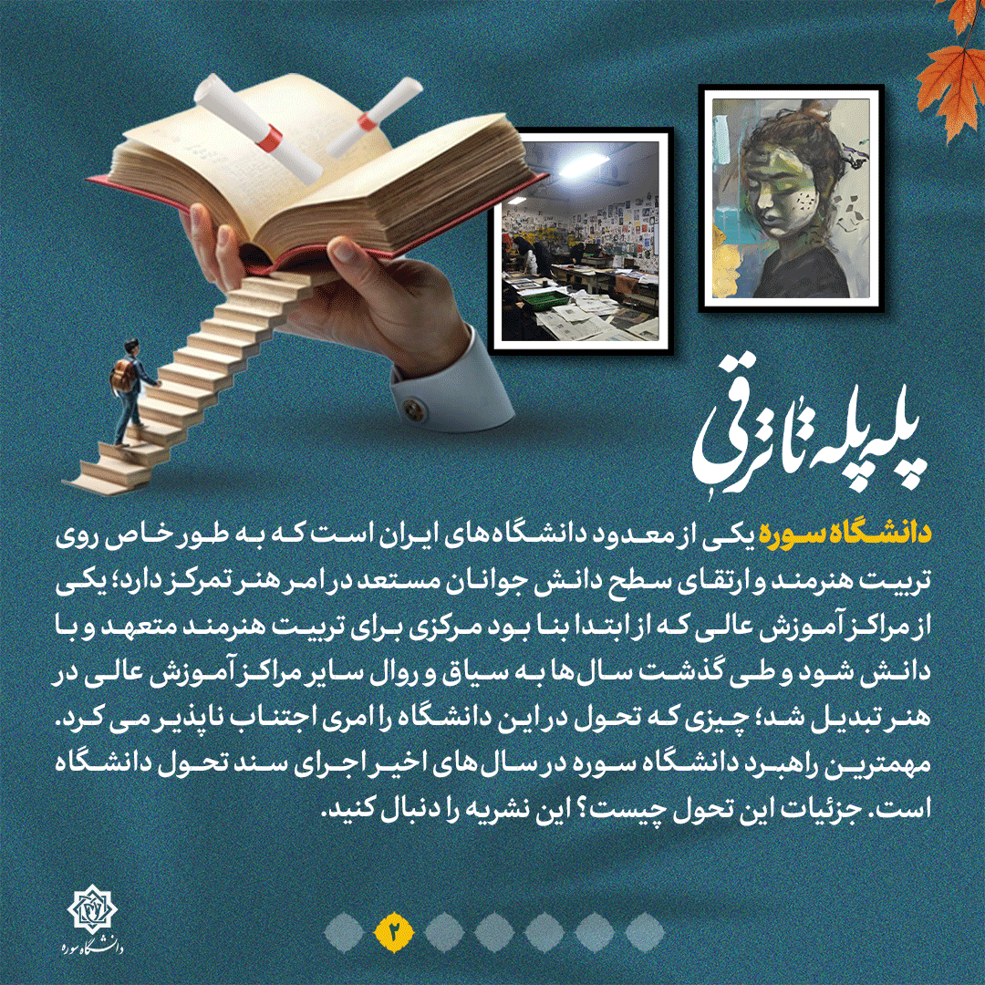 به گزارش روابط عمومی سازمان تبلیغات اسلامی، دانشگاه سوره یکی از معدود دانشگاههای ایران است که به طور خاص روی تربیت هنرمند و ارتقای سطح دانش جوانان مستعد در امر هنر تمرکز دارد؛ یکی از مراکز آموزش عالی که از ابتدا بنا بود مرکزی برای تربیت هنرمند متعهد و با دانش شود و طی گذشت سالها به سیاق و روال سایر مراکز آموزش عالی در هنر تبدیل شد؛ چیزی که تحول در این دانشگاه را امری اجتناب ناپذیر می کرد. مهمترین راهبرد دانشگاه سوره در سالهای اخیر اجرای سند تحول دانشگاه است. جزئیات این تحول چیست؟ این نشریه را دنبال کنید.