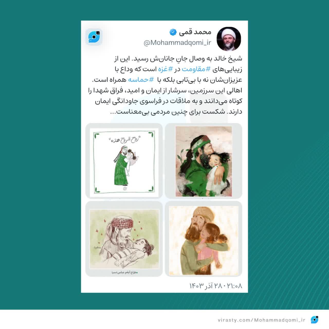 به گزارش روابط عمومی سازمان تبلیغات اسلامی، حجت الاسلام محمد قمی، رییس سازمان تبلیغات اسلامی با انتشار نوشتهای در صفحهی شخصی خود در شبکه اجتماعی ویراستی، ضمن اشاره به شهادت شیخ خالد و ماجرای جانسوز وداع او با پیکر بیجان نوهاش در غزه، از حماسهی مقاومت و شکستناپذیری اهالی مجاهد و مقاوم فلسطین نوشت.