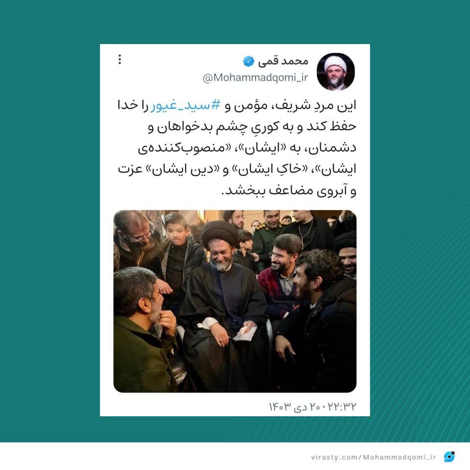 این مردِ شریف، مؤمن و سید غیور را خدا حفظ کند و به کوری چشم بدخواهان و دشمنان، به «ایشان»، «منصوب کننده ی ایشان»، «خاکِ ایشان» و «دین ایشان» عزت و آبروی مضاعف ببخشید.