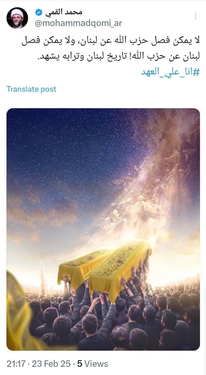 به گزارش روابط عمومی سازمان تبلیغات اسلامی، حجتالاسلام محمد قمی، رئیس سازمان تبلیغات اسلامی، در صفحه شخصی خود در شبکه ایکس پس از حضور در آئین با شکوه، بینظیر و معنوی تشییع پیکر شهیدان عزیز «سیدحسن نصرالله» و «سیدهاشم صفی الدین» در لبنان توئیتی به زبان عربی منتشر کرد.