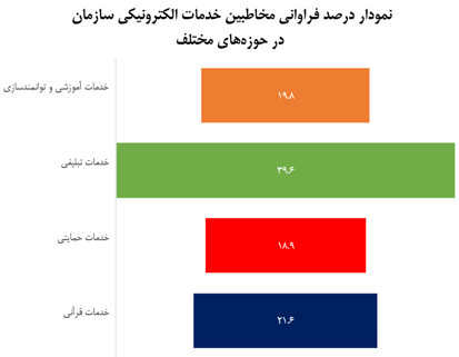براساس آمار حاصل از پاسخ سوال "بیشترین استفاده شما از پنجره واحد خدمات الکترونیک سازمان در حوزه کدام یک از خدمات زیر است؟" بیشترین متقاضی دریافت خدمات الکترونیکی سازمان در حوزه خدمات تبلیغی (اعزام و استقرار مبلغین و ائمه جماعات) بوده است که مشخصا در سامانه شمع (شبکه مبلغان و عملیاتهای تبلیغی) به کاربران ارائه میگردند. سایر خدمات الکترونیک سازمان در حوزههای قرآنی، حمایتی، آموزشی و توانمندسازی به صورت تقریبی، توزیع یکسانی در تعداد مخاطبین دارند.