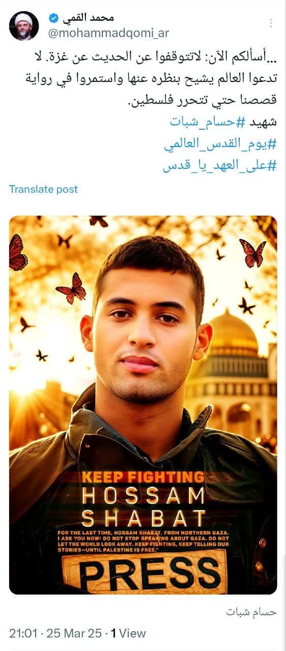 به گزارش روابط عمومی سازمان تبلیغات اسلامی، حجتالاسلام محمد قمی، رئیس سازمان تبلیغات اسلامی در شبکه اجتماعی ایکس و در آستانه روز قدس برای مخاطبان عرب زبان متنی از وصیتنامه شهید خبرنگار حسام شبات منتشر کرد.