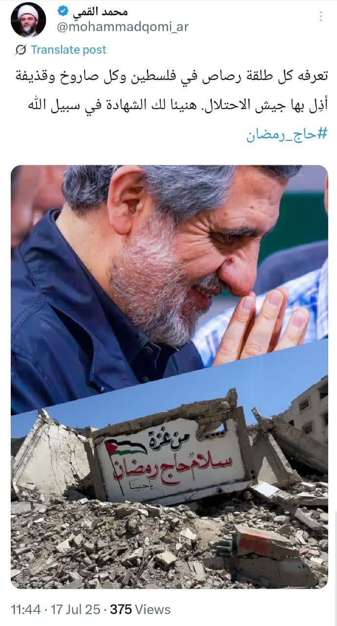 به گزارش روابط عمومی سازمان تبلیغات اسلامی، حجتالاسلام محمد قمی، با اشاره به شهادت سردار محمدسعید ایزدی (حاج رمضان) در صفحه شخصی خود در شبکه ایکس ویژه مخاطبان عرب زبان نوشت؛